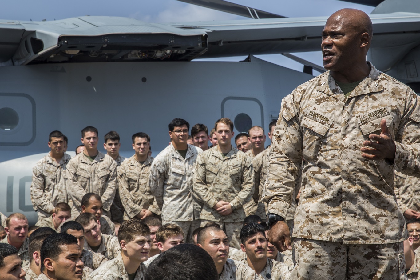 Col. Anthony M. Henderson, Commanding Officer of the 13th Marine Expeditionary Unit, addresses the Marines and Sailors aboard the USS New Orleans on April 4, 2016. https://news.usni.org/2016/09/12/13th-meu-co-argmeus-key-theater-mobile-forces