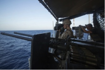 150428-M-YH418-055: STRAIT OF BAB AL-MANDEB (April 28, 2015) - Corporal Michael Connell, left, an anti-tank missileman with Weapons Company, Battalion Landing Team 3rd Battalion, 6th Marine Regiment, 24th Marine Expeditionary Unit, and Mineman 2nd Class Jared Williamson observe ships and terrain as part of a joint small caliber action team during a transit through the Strait of Bab al-Mandeb aboard the USS Sentry (MCM 3), April 28, 2015. The 24th MEU provided additional SCAT capabilities to the USS Sentry during the transit. The 24th MEU is embarked on the ships of the Iwo Jima Amphibious Ready Group and is deployed to maintain regional security in the U.S. 5th Fleet Area of operations. (U.S. Marine Corps photo by Cpl. Todd F. Michalek/Released)