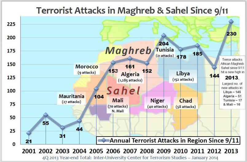 Terrorist attacks in the Maghreb and the Sahel increased an alarming 60 percent from the previous year, totaling 230 incidents regionwide, the highest yearly total since 9/11, according to a recent report from The Potomac Institute's Inter-University Center for Terrorism Studies.