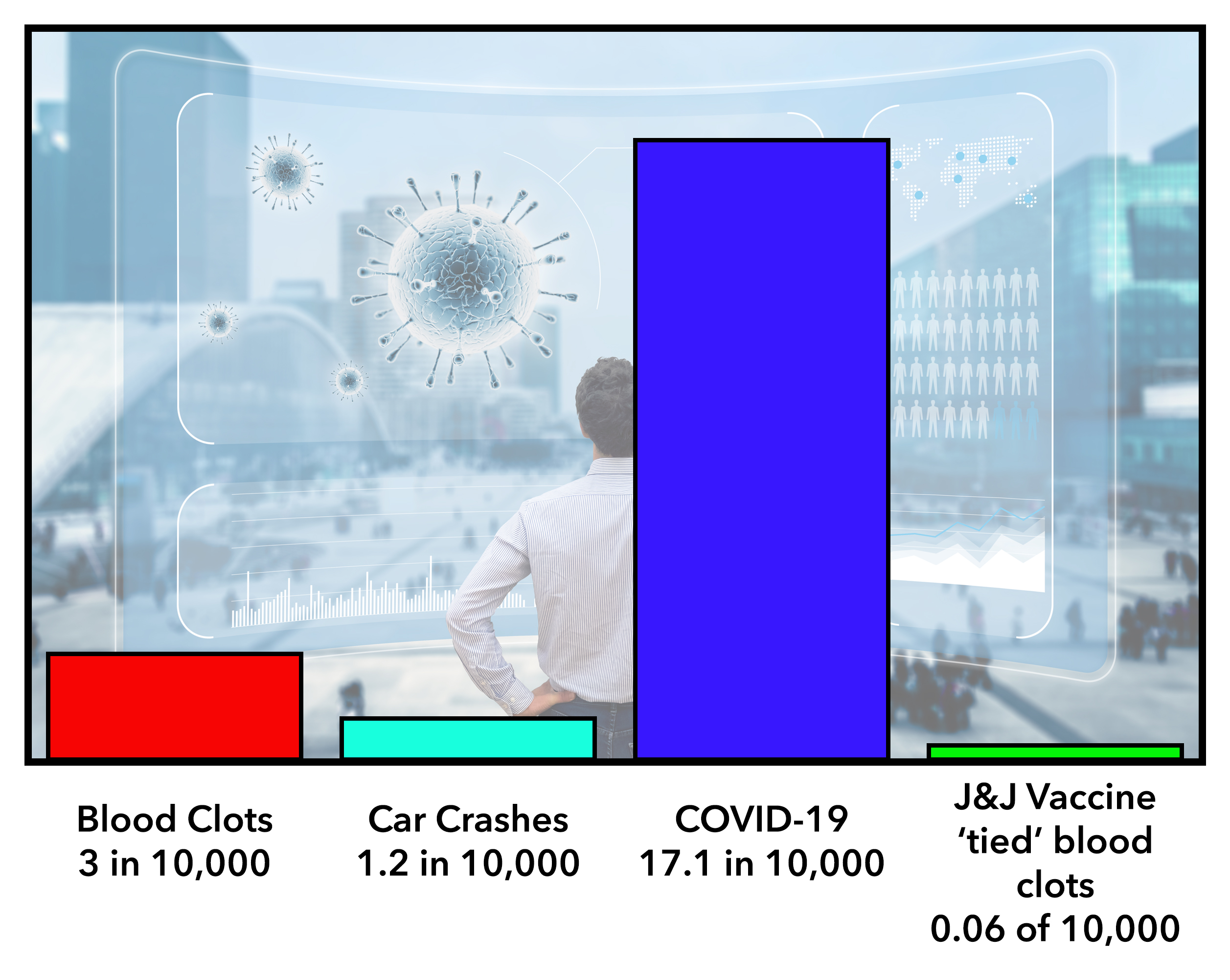 Blood clots affects up to 100,000 individuals a year, an incidence rate of about 3.0 in 10,000 for women1 (with the toll slightly higher for men).2 Compare that with the Johnson & Johnson vaccine “tied” blood clotting issue in women between the ages of 18 – 48 where the values of this “increased incidence” is 0.06 in 10,000 women 18-48 who received the vaccine. Never mind that car accidents have a death toll of 1.2 in 10,0003 or that women whom use birth control take the risk of increased blood clot with the incidence rate of about 1 in 3004, COVID-19 itself has killed 17.1 in 10,000 Americans5. We are comparing a 0.06 and a 17.1 rate.