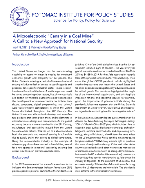 The United States no longer has the manufacturing capability or access to materials needed for continued economic growth and prosperity for our people. The United States is entering a period of increased national security risk due to lack of access to specific goods and products. One specific industrial sector—microelectronics—is emblematic of the issue. A similar argument could be posed concerning other sectors, like pharmaceuticals and certain raw minerals. But technologies that underpin the development of microelectronics, to include transistors, computers, digital programming, and others,1 were transformative technologies in which the United States dominated throughout the 20th Century. The United States was able to both develop and manufacture products that sprang from them, and to dominate in microelectronics design and manufacture. As the global economy became more entrenched in the 21st Century, manufacture and accessibility moved from the United States to other nations. This has led to a situation where both the economic and national security is vulnerable due to supply chains that extend to global competitors. Using the semiconductor industry as the example of where supply chains have created vulnerabilities, we call for a new approach to national security by ensuring that critical industries can provide assured access.